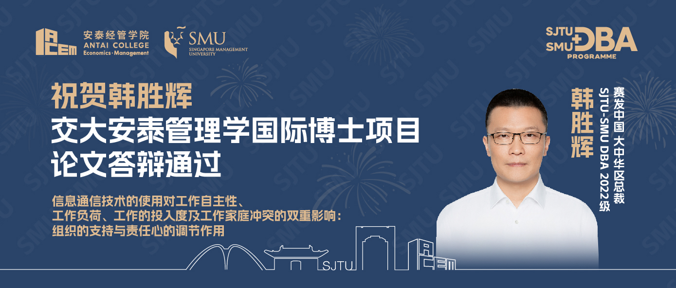 上海交通大学管理学国际博士项目(DBA)是安泰经济与管理学院与国际知名商学院联合举办的高等学位教育项目,结合中西方顶尖学术力量,立足中国、放眼全球、旨在培养集应用、管理、研究大成于一体的企业家和管理者。目前已与新加坡管理大学李光前商学院、法国南特高等商学院从不同研究方向联合培养企业家学者。通过系统化的学习研究理论与方法,促进商业实践与学术的结合。学员从不同的视角来探索全球商业社会,在系统学习和论文答辩后,获得国际商学院工商管理博士学位。